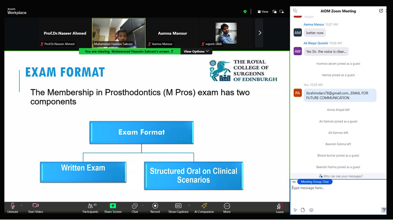 The session, led by Dr. Ibrahim Dars, FCPS trainee in the Department of Prosthodontics, provided comprehensive guidance on navigating the MProsthodontics examination pathway.