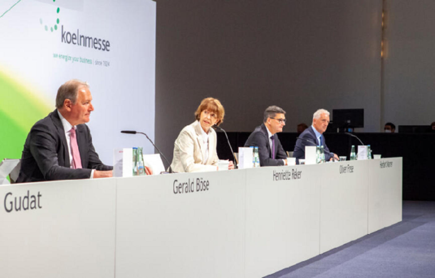 Annual Press Conference 2020, fltr: Gerald Böse (President and Chief Executive Officer), Henriette Reker (Mayor of the City of Cologne and Chairwoman of the Supervisory Board of Koelnmesse), Oliver Frese (Chief Operating Officer), Herbert Marner (Chief Financial Officer)