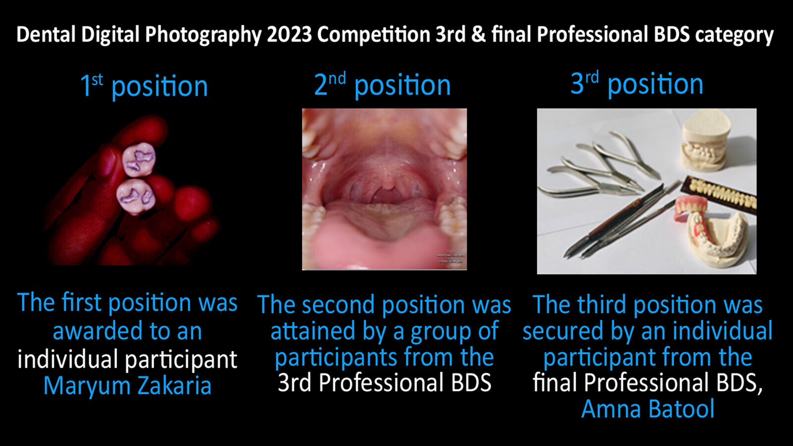 1st & 2nd Professional BDS: The first position was secured by a group of participants from the 1st Professional BDS, which included M Hashim Gazdar, M Shaharyar Abdullah, M Umaid Noor, M Areeb, Rahayma Hayat, Minahil Zahid, Sana Hussain Memon, Maheera Junaid, Nabeera Baig, and Nameera Sohail. The second position was claimed by another group of participants from the 1st Professional BDS, consisting of Warisha Nadeem, Warisha Asif, Maheen Maqsood, Salman Jamil, and Shayak Jan. The third position was secured by an individual participant from the 2nd Professional BDS, Arouba Mukhtar.